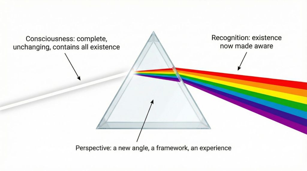 Consciousness works the same way. Every new perspective you gain — every framework you study, every experience you move through — is a prism. It doesn’t add to you. It reveals what was already structurally inside you, waiting for the right angle to make it visible.