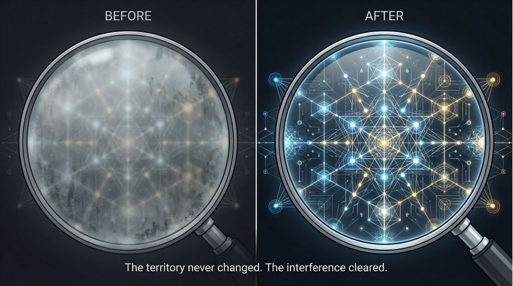 This is a precise and important distinction. It means the goal of learning is not to fill yourself up. It is to clear the interference between the structure of your awareness and the territory it is attempting to map. Every genuine insight removes an obstruction. Every mastered framework clears a layer of static.